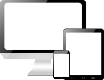 This features a white and black illustration of three electronic devices: a computer, a tablet, and a smartphone. Each device is placed next to each other, creating an organized and visually appealing arrangement. The computer screen takes up the majority of the space on the left side, while the tablet occupies the middle area, and the smartphone is positioned towards the right side. This artistic representation showcases the various forms of technology that people use in their daily lives.