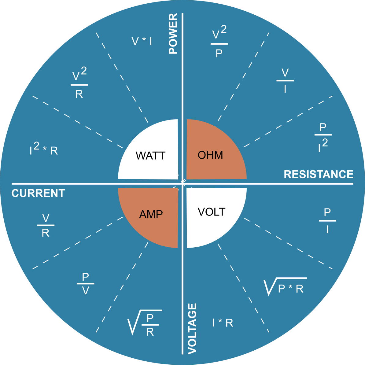 This is a circular diagram that illustrates the relationship between power, resistance, voltage, and current. It features several equations throughout the circle, providing an in-depth understanding of these concepts. The diagram is divided into four main sections, each representing one of the relationships: power (Watts), resistance (Ohms), voltage (Volts), and current (Amps). Each section has a central point that represents the relationship between the variables. The circle is filled with various mathematical symbols and numbers, making it an informative visual aid for learning or teaching these concepts. The diagram also includes a clock face in one of its sections, which adds another layer of complexity to the illustration. Overall, this image effectively conveys the interconnectedness of power, resistance, voltage, and current through its use of equations and diagrams.