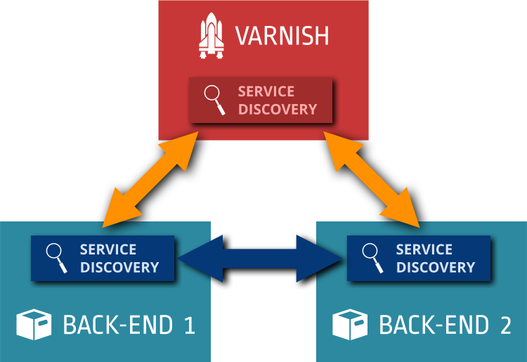 This depicts a diagram that illustrates the relationship between two main components: Varnish and Backend. Varnish is represented by a red slide, while the Backend is shown in blue slides. These two elements are connected through a service discovery process, with Varnish being responsible for managing the service discovery. The image also includes a search function, as indicated by the presence of a magnifying glass symbol. This search function likely assists users in locating specific services within the system. Overall, the diagram provides an overview of how these two components work together to facilitate efficient service discovery and management.