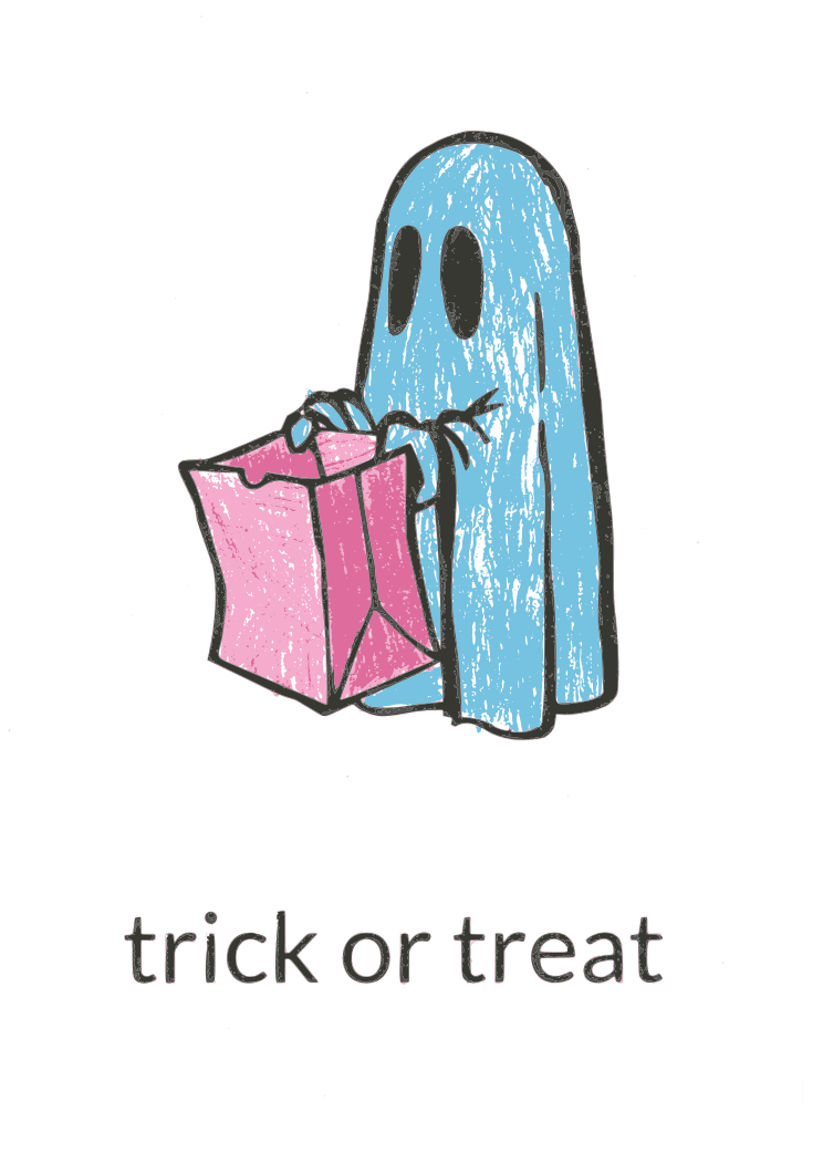 This features a blue ghost holding a pink bag, which is labeled "trick or treat." The ghost appears to be wearing a shirt and has its arms outstretched as it holds the bag. The illustration is in black and white, giving it a classic feel. This creative image could be used for various purposes such as Halloween decorations, greeting cards, or even as part of a children's book.