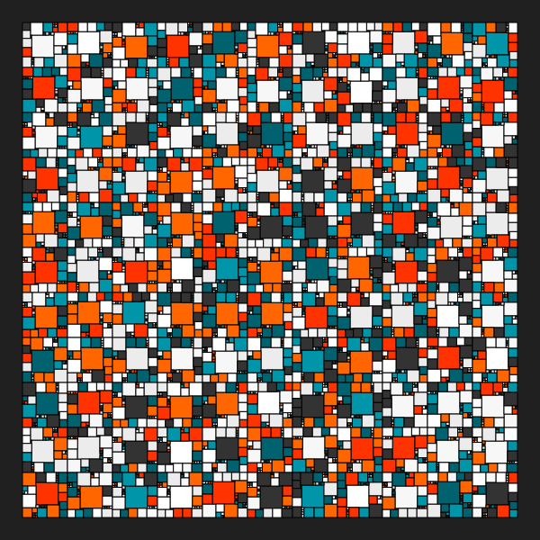 This is a close-up of a colorful tiled grid made from various colored tiles. The colors in the grid include red, orange, white, blue, and teal. There are also black squares surrounding the grid, giving it an interesting visual effect. The tiles are arranged in such a way that they create a visually appealing pattern, making for an intriguing design.