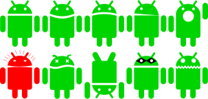 This features a collection of ten Android icons, with nine of them being green and one red. Each icon has a different facial expression, adding variety to the scene. The green icons are arranged in various positions across the image, while the red icon stands out as it is positioned at the top left corner. This unique arrangement creates an interesting visual display that showcases the diversity of Android icons and their expressions.