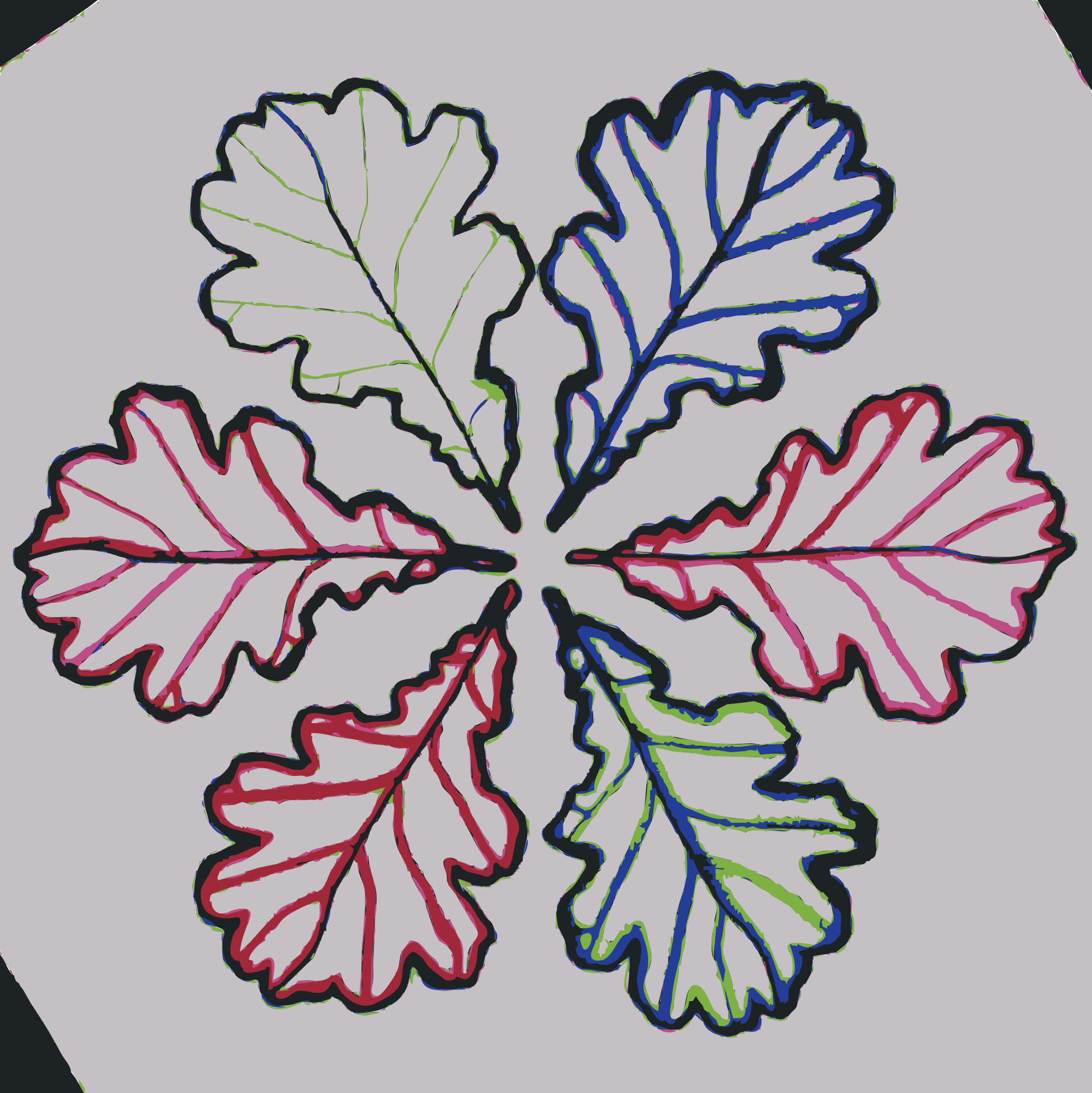 This features a beautiful illustration of six leaves, each colored in shades of red, green, and blue. These leaves are arranged in such a way that their tips touch, creating an eye-catching flower shape. The colors used for the leaves are vibrant and create a visually appealing contrast against one another. This artistic representation of leaves can be appreciated by anyone who enjoys nature or has an interest in colorful designs.