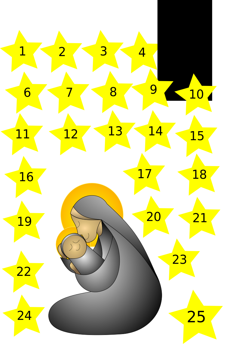 This features a beautifully drawn picture of Mary holding baby Jesus. The scene is set against a backdrop of stars, which are scattered throughout the image in various sizes and positions. There are 19 stars visible in total, with some located near the top left corner, others towards the center, and a few more on the right side of the image. This artistic representation captures the essence of Mary's love for her child while also adding an element of celestial charm to the scene.