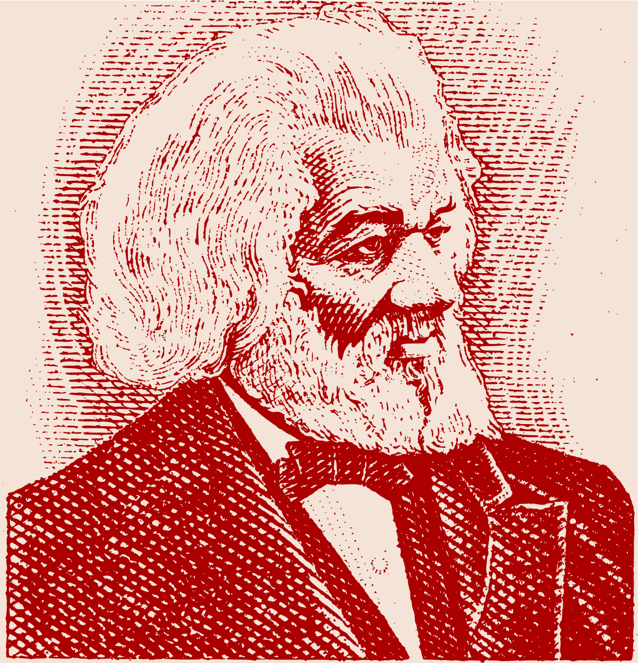 This is a red and white colored portrait of Frederick Douglass, an African American social reformer. He has long white hair and beard, giving him a distinguished appearance. His smile suggests that he is happy or content in the moment. The portrait captures his essence as a prominent figure in history who fought for equality and justice for all people.