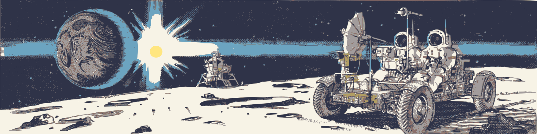 This features a unique illustration of two astronauts in outer space driving on the moon. They are riding in a vehicle that is designed to traverse the lunar terrain, with a large wheel visible beneath them. In addition to the main scene, there are several other elements present in the background. A planet can be seen towards the left side of the image, while the sun is located further back on the right side. The illustration also includes a spacecraft that appears to be flying through the sky above the moon's surface. This artistic depiction captures the imagination and showcases the adventurous spirit of space exploration.