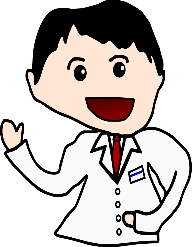 This features a cartoon character wearing a white coat and tie, with a blue tag on it. This character appears to be waving at the viewer, giving off a friendly and approachable vibe. The character's facial expression is one of happiness, as they are smiling brightly. The overall appearance of this cartoon figure gives an impression of professionalism and friendliness, making them suitable for various settings or situations where a welcoming and approachable presence is desired.