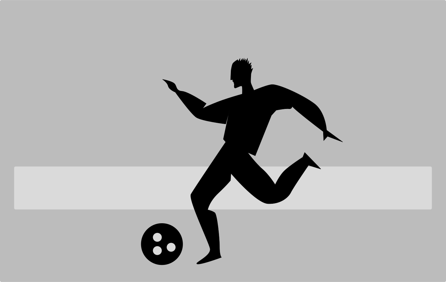 This features a silhouette of a man running with a soccer ball in his hand. He appears to be kicking the ball as he moves across the scene. The man is positioned towards the center of the image, and the soccer ball is located slightly below him on the left side. This illustration captures an action-packed moment from a game of soccer.