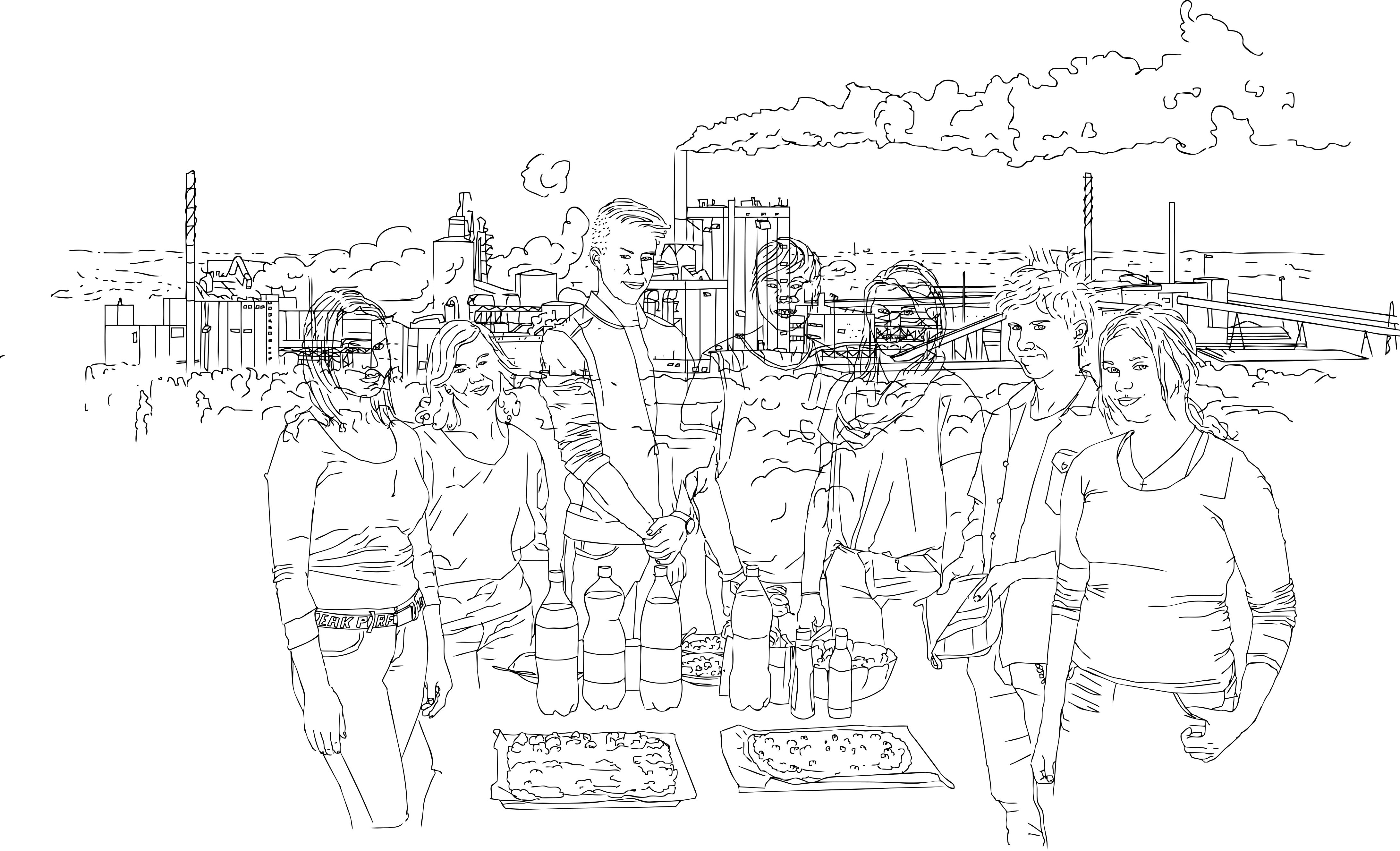 This is a black and white drawing of a group of people standing together. They are all wearing ties, which suggests that they might be workers or employees in an industrial setting. There are at least 13 individuals visible in the scene, with some standing closer to the front while others are positioned further back. The group appears to be gathered for a meal or break, as there is a bowl and a cup placed on the ground near them. The overall atmosphere of the drawing suggests camaraderie among the workers, who may be taking a moment to relax and socialize during their workday.