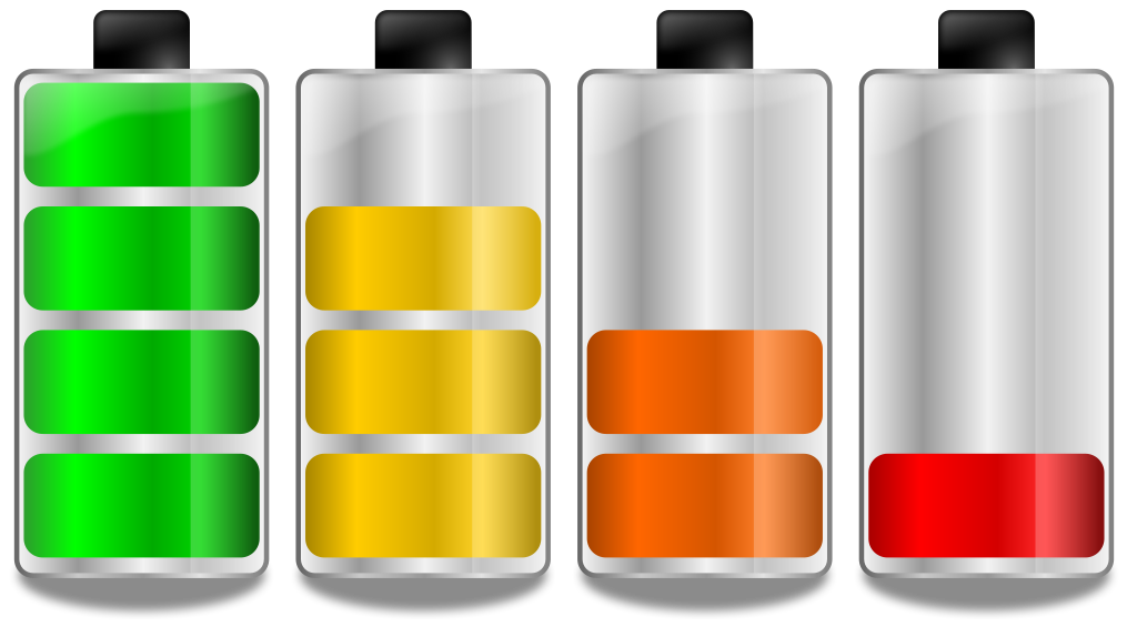 This displays four different colored batteries, each with varying levels of charge. On the left side, a fully charged battery is depicted in green, while on the right side, an almost empty battery is shown in red. In between these two extremes are three other batteries, one yellow and two orange, representing various degrees of charge. The arrangement of these four batteries creates a visually appealing representation of their energy levels.