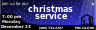 This is a blue and white advertisement for a Christmas service. It features the words "Join us for our Christmas Service" in large letters at the top of the page, with an arrow pointing downwards to indicate where the event will take place. Below this, there are several times listed for the service, including 7:00 pm on December 23rd and 10:00 am on December 24th. The advertisement also includes a picture of a church steeple in the top right corner.