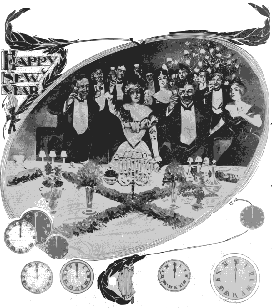 This is a black and white drawing of a group of people gathered around a dining table, celebrating New Year's Eve. There are at least 14 people in the scene, all dressed up for the occasion. They are raising their glasses in a toast to someone or something, possibly to the viewer. The table is set with various items such as wine glasses, cups, and bowls. A cake can also be seen on the table, adding to the festive atmosphere of the scene. The drawing captures the essence of a New Year's Eve celebration, where friends and family come together to enjoy each other's company and make memories. The image evokes feelings of warmth, joy, and togetherness as people gather around the table to share in the festivities.