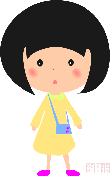 This features a cartoon character, specifically a little girl with black hair and a yellow dress. She is wearing a purse on her shoulder and appears to be looking upwards or possibly making a funny face. The drawing of the girl has a handbag attached to it, adding an extra touch of detail to the scene. The overall composition of the image gives off a playful and whimsical vibe.