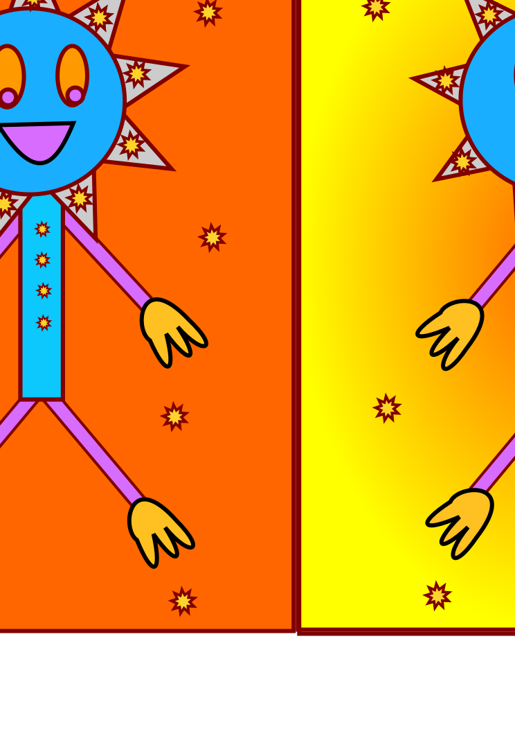 This features a cartoon character, possibly a sun or a blue and yellow figure, standing in front of an orange background. This character appears to be the main focus of the scene, with its arms outstretched as if it is reaching for something. In addition to this main figure, there are several smaller figures scattered throughout the image, some of which may represent additional characters or elements within the scene. The overall composition creates a lively and engaging atmosphere that captures the viewer's attention.
