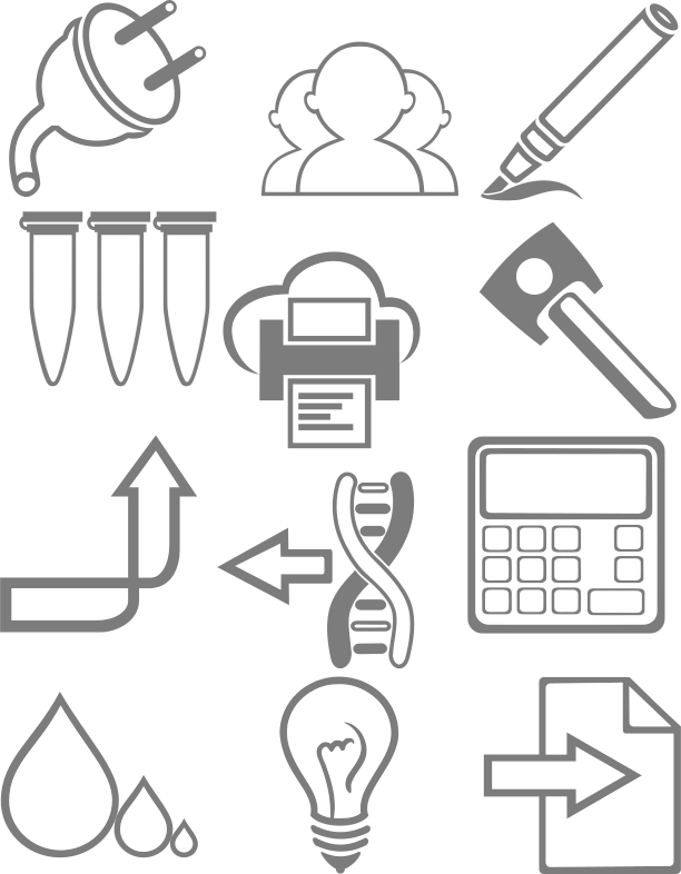 This features a collection of various technology icons, including an electric plug, a group of people, a pen, reaction tubes, cloud printing, a key, an arrow pointing upward, a strand of DNA, a calculator, different sized water drops, a light bulb and a sheet of paper. The icons are arranged in a visually appealing manner, showcasing the diverse range of technology-related items. These icons can be used to represent various concepts or ideas related to science, technology, or engineering.