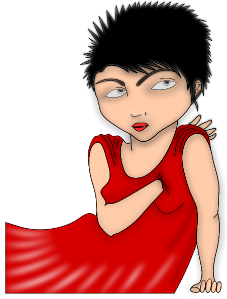 This features a woman with short spiky hair, wearing a red dress. She is posing for the camera and has her hand through her chest. Her expression appears to be somewhat angry or displeased as she stares into the distance. The overall scene gives off an artistic vibe, possibly from a comic book or cartoon character.