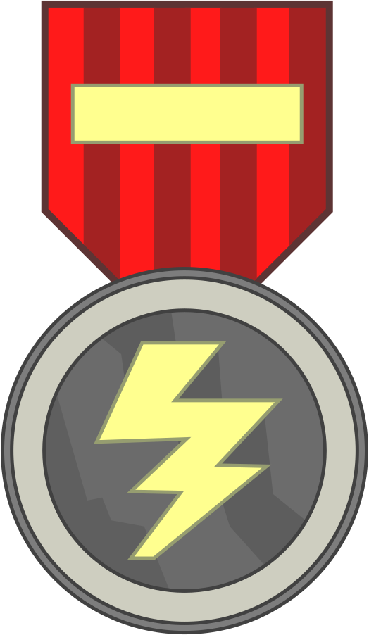 This features a medal with an emblem of a lightning bolt inside it. The medal is made of metal and has a brown color to it, giving it a vintage appearance. The lightning bolt symbol is yellow in color, making it stand out against the background. This medal could be used as a decorative piece or for awarding achievements, with its unique design and striking colors.