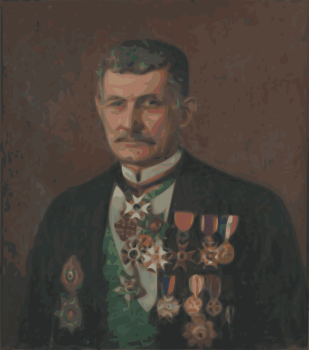 This is a black and white portrait of an older man wearing a suit with medals pinned to his lapel. He has a mustache, and appears to be quite distinguished in appearance. The man's attire suggests that he may have been involved in military or governmental service, as evidenced by the numerous awards and decorations adorning his coat. The portrait captures the essence of an older gentleman who has likely accomplished much throughout his life, and is now being commemorated through this artistic representation.
