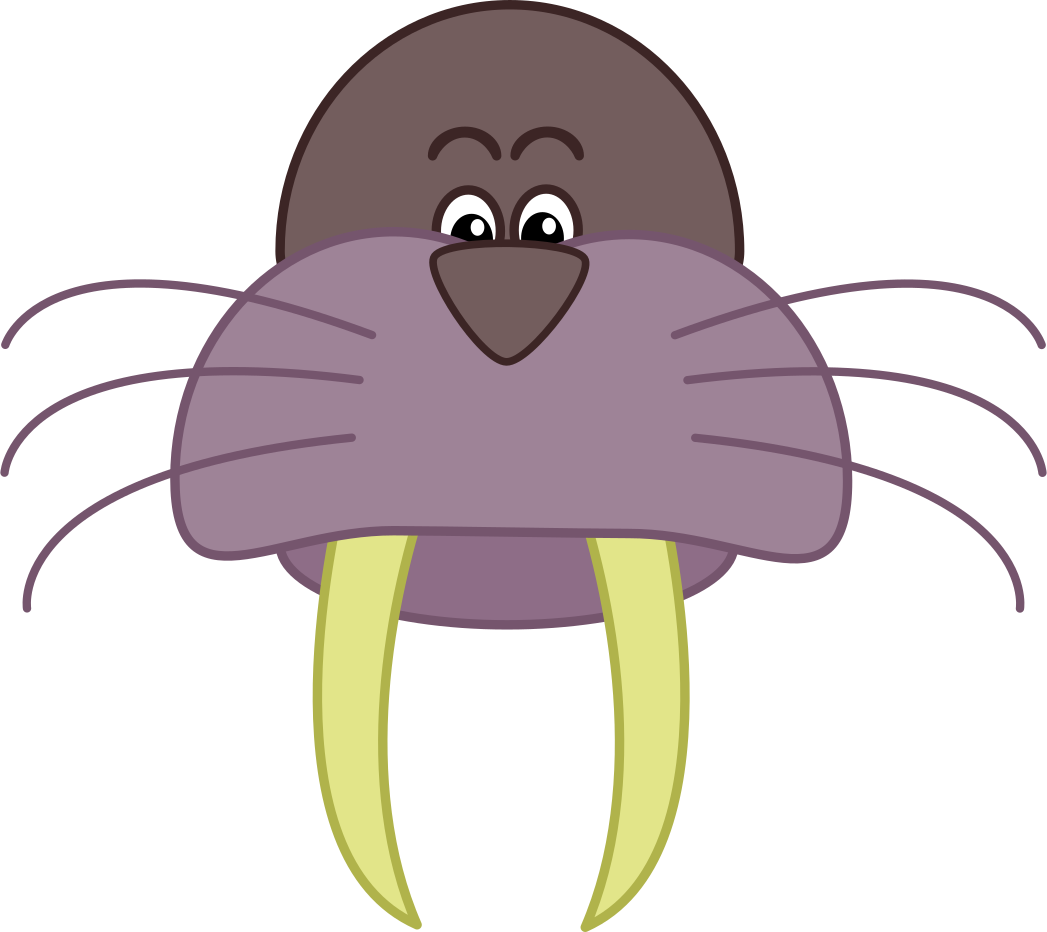 This features a cartoon walrus with a purple face and whiskers. It has two large, white tusks that extend outwards from its mouth. The walrus's eyes are wide open, giving it an amusing appearance. Its whiskers are long and visible on both sides of the face, adding to its unique character. This funny cartoon walrus is likely meant for entertainment or as a decorative element in a children's room or play area.