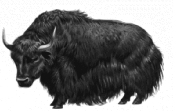 This features a large, furry bison with horns standing in the snow. It appears to be a black and white drawing of the animal, giving it an old-fashioned or vintage appearance. The bison is positioned towards the left side of the image, taking up most of the frame. Its size and presence make it the focal point of the scene.