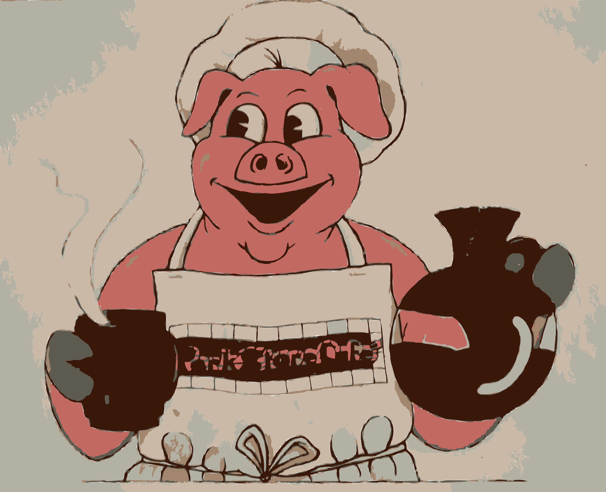 This features a cartoon pig wearing an apron and holding two bottles. The pig is smiling, giving the impression that it's happy to be cooking or preparing something. It appears to be in a kitchen setting, possibly at a restaurant. The pig seems to be enjoying its time as it holds up the bottles with pride.