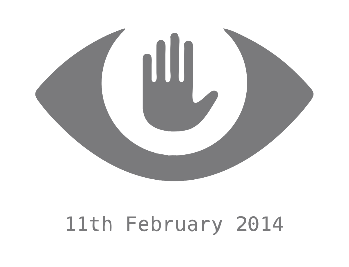 This features a gray eye with a handprint in it, symbolizing the importance of privacy and individuality. Underneath the eye and hand is the date February 11th, 2014, which indicates that this illustration was created during that time period. The logo used for fighting back against mass surveillance serves as a reminder to protect our personal information and maintain control over our digital lives.