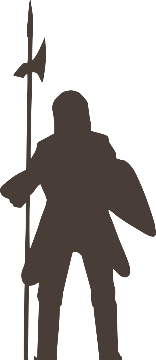 This features a silhouette of a knight in armor standing with a halberd in his hand. He is positioned on the left side of the frame, and his figure appears to be quite large as he fills most of the space within the image. The knight's armor is clearly visible, giving him an imposing presence. The overall composition of the image creates a sense of depth and dimension, with the knight standing out against the background.