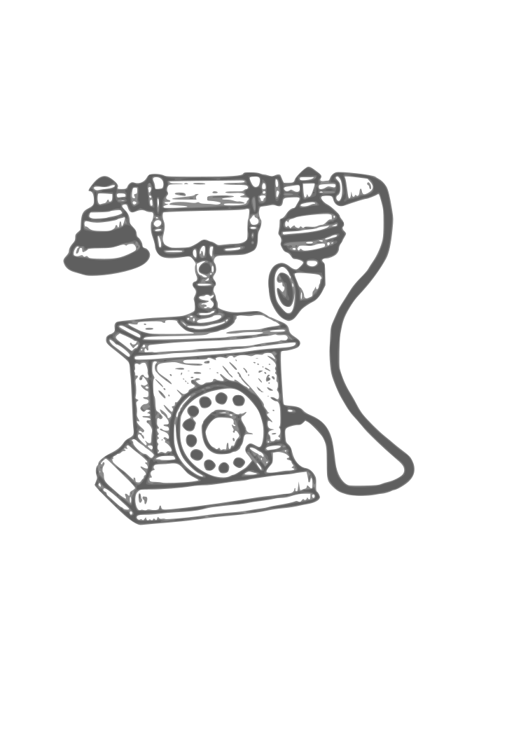 This features a vintage telephone with two bells on top, sitting on a table. The phone is connected to a cord and has a rotary dialer for making calls. The drawing of the telephone is in black and white, giving it an old-fashioned appearance. This classic device represents a bygone era when landline phones were the primary means of communication.