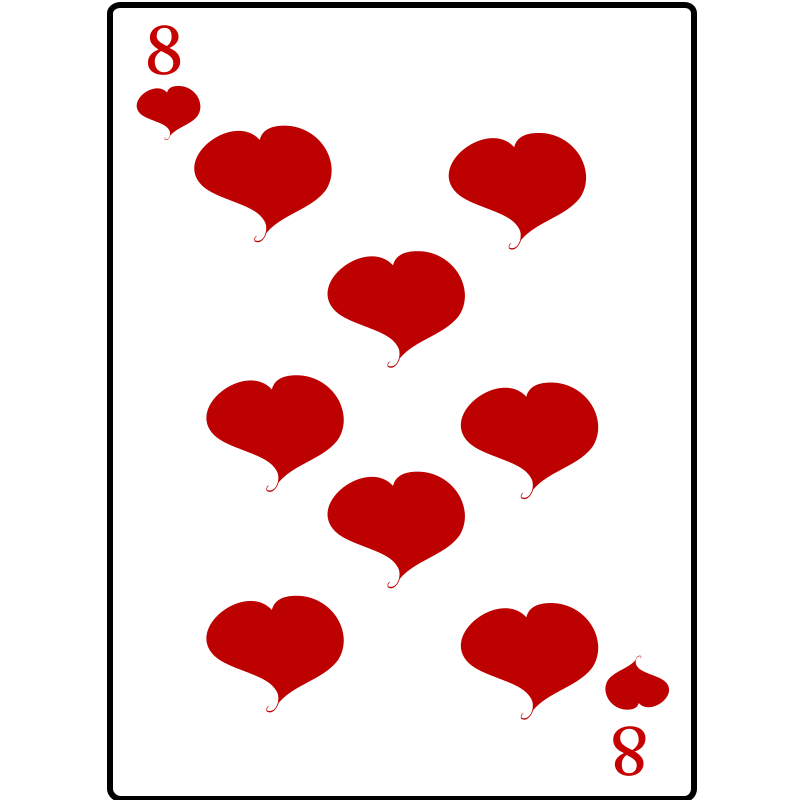 This features a deck of cards with the number 8 on it. The card is decorated with hearts, and there are several red hearts scattered throughout the design. These hearts come in various sizes and positions, creating an eye-catching pattern that makes the card stand out. The combination of the number eight and the heart theme gives the deck a unique and playful appearance.