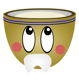 This features a cartoon-like bowl with a blue band around the top. It has two eyes and a mouth, giving it a playful appearance. The bowl is filled with a white substance that appears to be cream or milk. This whimsical design makes for an interesting and fun visual representation of a bowl.