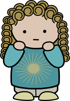 This features a cartoon character with curly hair, wearing a blue shirt. The character appears to be sad or frowning as it stands in front of the camera. The shirt has an interesting design on it, featuring yellow suns and stars. The overall appearance of the character is quite cute and endearing.