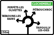 This is a street sign in French, indicating the direction to various locations. It shows a roundabout with several streets and destinations labeled on it. These include ClocHemerle, Perpettes-Les Olives, Petaouche, Tataquine-Les Bains, Triffoilly Les Les Elieses, and 150m. The sign is likely meant to guide drivers through the area and help them navigate their way around the roundabout.