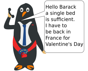This features a penguin dressed in a suit and tie, holding a cell phone to its ear. It is wearing a red tie with the words "hello barack" written on it. The penguin appears to be talking into the phone while standing next to a bed. In addition to the main character, there are two other smaller figures present in the image - one located near the top left corner and another at the bottom right corner of the picture.