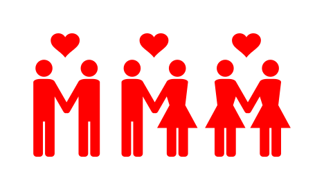 This features a group of six people, each holding hands and standing next to one another. They are all dressed in red clothing, which adds a sense of unity and love among the individuals. Three couples can be seen within this group, with two of them being gay and the third couple consisting of a man and woman. The image conveys a message of inclusivity and acceptance for everyone, regardless of their sexual orientation or relationship status.