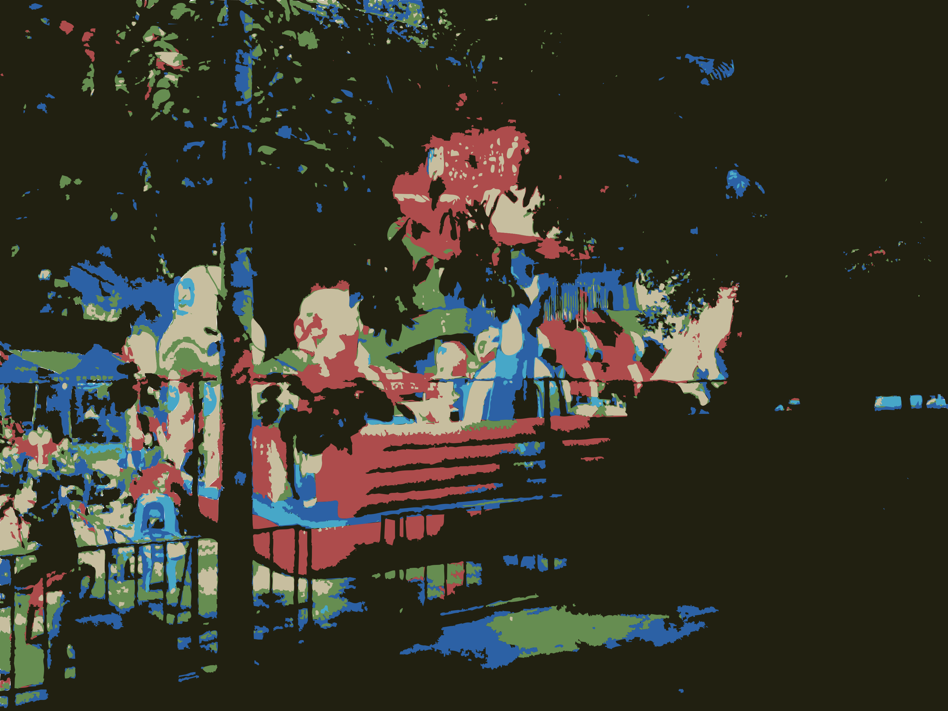 This features a colorful scene with several people and objects. There is a large red bouncy castle in the center of the picture, surrounded by trees. A group of children can be seen playing on the bouncy castle, enjoying their time outdoors. In addition to the bouncy castle, there are multiple benches scattered throughout the scene, providing seating for those who wish to relax and watch the festivities. The overall atmosphere appears lively and fun, with people of all ages participating in the activities.