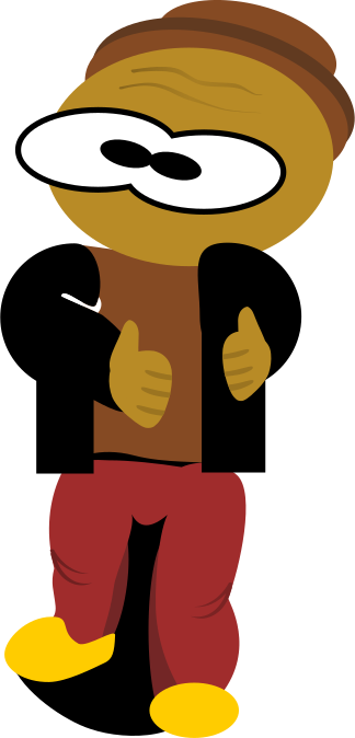 This features a cartoon character with a brown hat and red pants, giving it the appearance of a beetle. This character is wearing a black jacket and has a big smile on its face, indicating that it is happy or excited about something. It appears to be standing in front of a wall, possibly posing for a picture. The cartoon character's design gives it an amusing and playful appearance, making it suitable for various types of media such as children's books, animated films, or video games.