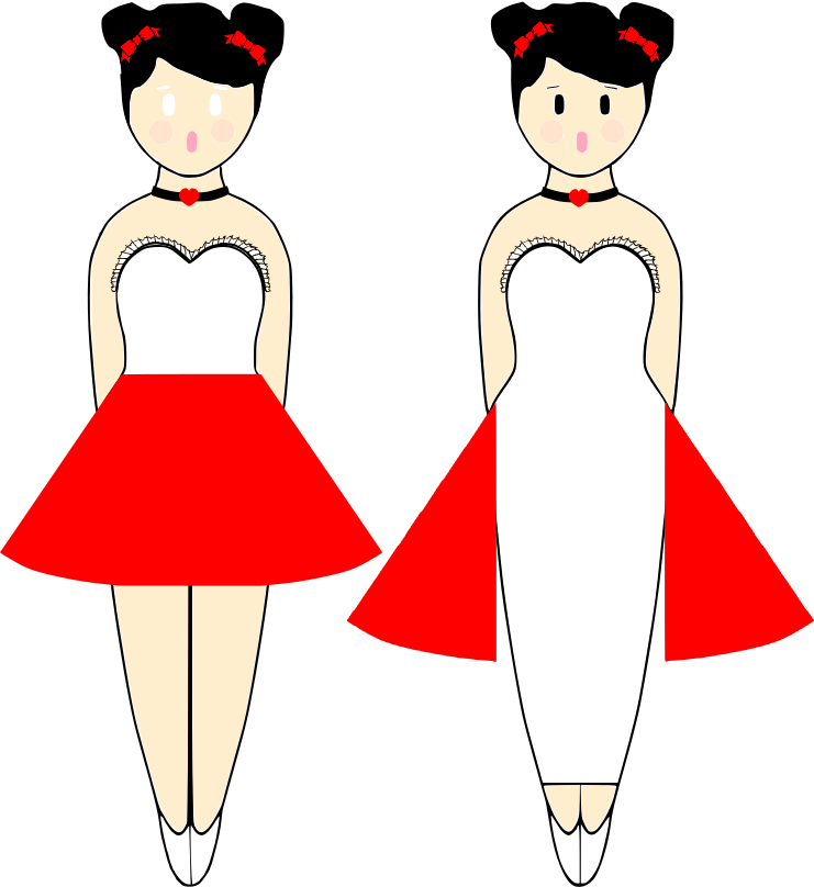This features two cartoon illustrations of women dressed in red and white dresses. Both women are wearing identical chokers, with one woman's choker being red while the other is white. They both have their hair styled in buns, adding to the uniform appearance of the two characters. The first woman is depicted in a short dress, with the upper part of her outfit being white and the bottom portion being red. The second woman is wearing a long dress that also features a combination of white and red colors. Both women are standing side by side, showcasing their matching attire and hairstyles.