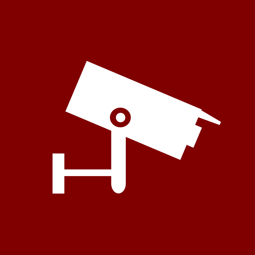 This features a red background with an illustration of a white surveillance camera. The camera is prominently displayed in the center of the scene, and it appears to be mounted on a stand or pole. This simple design effectively conveys the concept of security monitoring without any unnecessary details or distractions.
