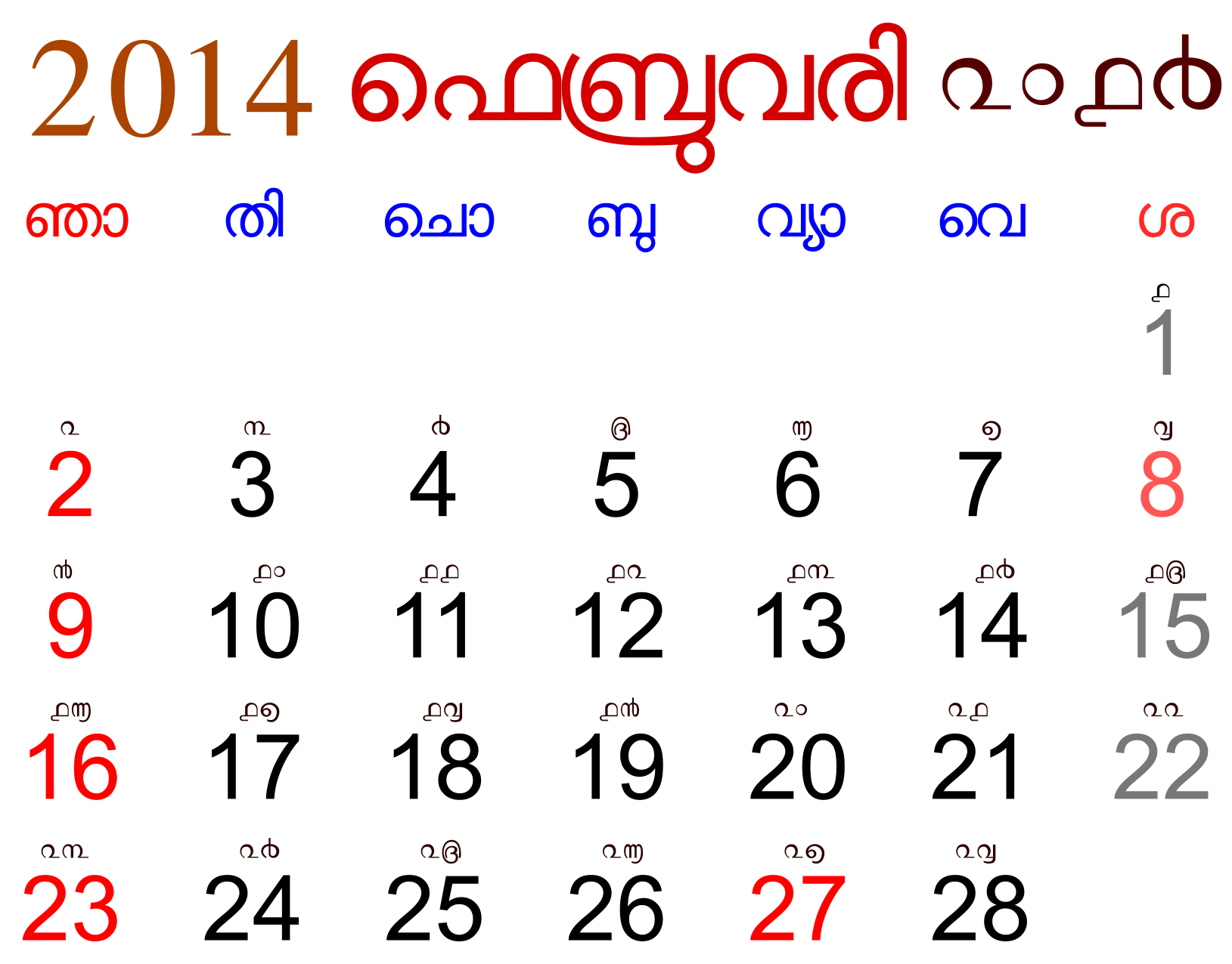 This displays a calendar for the year 2014, written in both English and Malayalam. It is a wall calendar with each day of the month labeled on it. The calendar has a red background and blue numbers, making it visually appealing. The days are arranged in a grid-like pattern, with each day being represented by a number from 1 to 30. This calendar would be useful for someone who wants to keep track of their daily schedule or appointments while also staying organized.