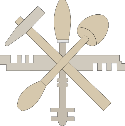 This features a cross-like design with four tools crossed in the middle. These tools are made of wood and have black outlines, giving them an old-fashioned appearance. There is a hammer on one side, while two wrenches can be seen on the other sides. Additionally, there is a spoon placed at the top right corner of the image. The combination of these tools creates a unique and interesting visual representation.