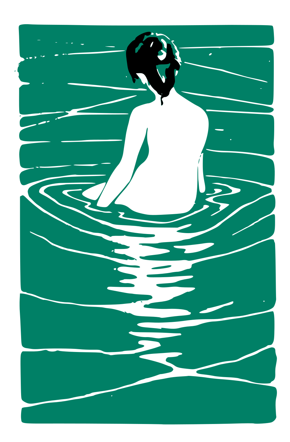 This features a woman in a green hot spring, or onsen. She is sitting with her back to the viewer and appears to be enjoying her time in the water. Her hair is black, and she has a white body. The scene takes place in a serene environment, as there are no other people visible in the image. The woman's positioning within the onsen suggests that she might be taking a break from swimming or simply relaxing while soaking in the water.