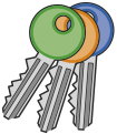 This features a close-up of three keys, each with different colored tops. The first key has a green top, the second one is orange, and the third one is blue. These keys are arranged in such a way that they appear to be stacked on top of each other. The colors of the keys create an interesting contrast against the white background, making them stand out prominently in the image.