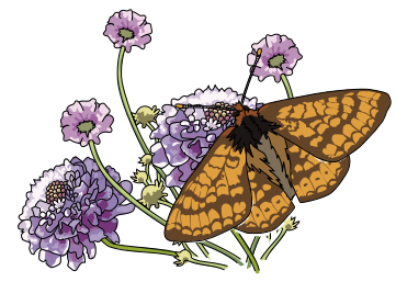 This features a beautifully drawn butterfly perched on top of a purple flower. The butterfly is positioned in the center of the scene, with its wings spread out and its body resting on the flower petals. The flower itself has a distinctive marsh fritillary appearance, which adds to the overall charm of the illustration. This artistic representation captures the delicate beauty of both the butterfly and the flower, creating an eye-catching scene that showcases the natural world's intricacies.