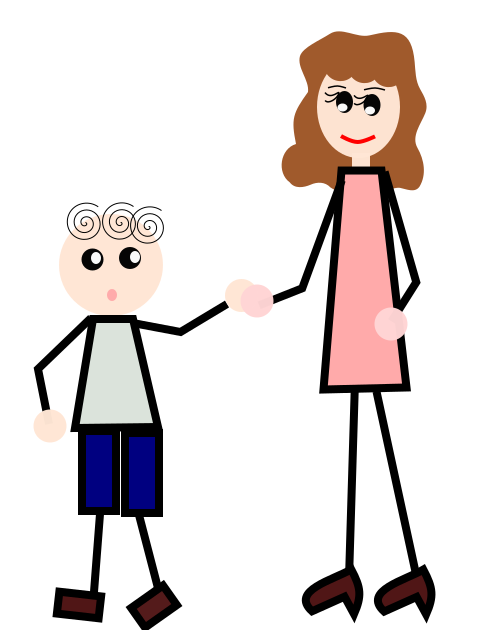 This features a woman and a young boy standing next to each other, with the woman holding the boy's hand. They are both dressed in pink clothing, which adds a touch of color to the scene. The woman appears to be taller than the child, as she stands beside him. The two figures seem to be enjoying their time together, possibly engaging in conversation or simply sharing a moment of bonding.