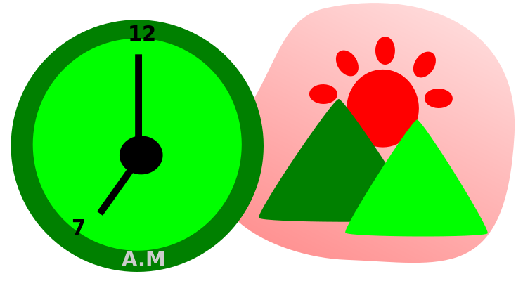 This features a green clock with the time of 10:35 AM displayed on it. Next to the clock, there is an illustration of a mountain and sun. The clock is positioned in the upper left corner of the image, while the mountain and sun are located towards the right side. This combination of elements creates a visually appealing scene that represents the passage of time and the beauty of nature.
