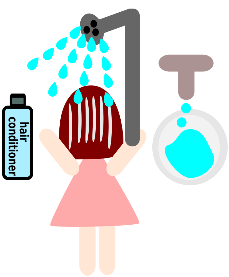 This features a cartoon-like girl with a pink dress, standing in front of a sink and holding a bottle of hair conditioner. She is showering her hair with the conditioner using a shower head. The scene also includes a toilet located on the right side of the bathroom. The overall composition of the image gives an impression of a fun and playful atmosphere, as it portrays a common everyday activity in a lighthearted manner.