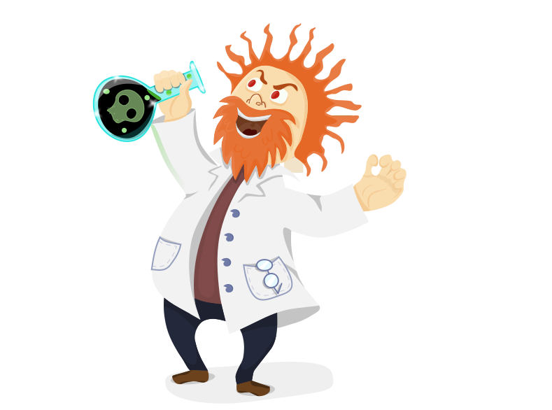 This features a cartoon character, possibly a mad scientist or a bearded man with red hair and a beard. He is holding a bottle in his hand while making a funny face. The character appears to be wearing glasses and has a lab coat on, giving him the appearance of a scientist. His facial expression suggests that he might be playfully mocking or teasing someone with the contents of the bottle.