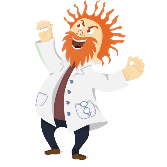 This features a cartoon character with an orange beard and hair, wearing a lab coat. He has his hands in the air and appears to be making a funny face as he poses for the picture. This character seems to be a mad scientist or a similar eccentric figure, adding a touch of humor to the scene. The colorful design of the cartoon adds an element of whimsy to the overall composition.