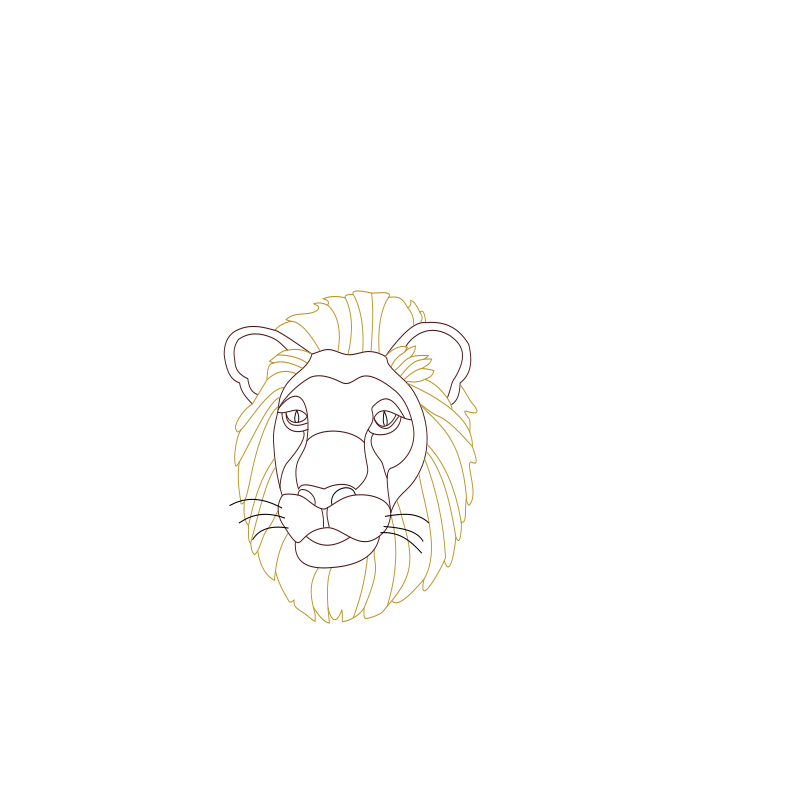 This features a close-up of a lion's head, with its eyes wide open and staring directly at the viewer. The lion has a mane that is long and flowing, giving it an impressive appearance. The color palette of the drawing is predominantly gold, which adds to the majestic feel of the lion. The image captures the essence of this powerful animal in a striking manner, making it an interesting visual piece.
