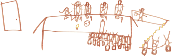 This is a creative and imaginative drawing of Jesus and his twelve disciples gathered around a dining table. The scene depicts the Last Supper, with each person seated on chairs placed around the table. There are numerous figures in the picture, including Jesus at one end of the table and the other disciples positioned around him. The table is set with various items such as a wine glass, a cup, and a bowl. Additionally, there are two knives visible on the table, possibly used for cutting bread during the meal. The drawing also includes some elements from the story of Jesus' arrest, including Judas holding money in his hand and soldiers taking Jesus away. Overall, this artwork showcases the child's perspective on a significant religious event in history.